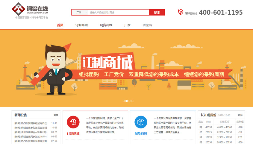 銅鋁在線是洛陽銅創(chuàng)電子商務有限公司傾力打造的銅鋁有色金屬電子商務交易平臺。在互聯(lián)網(wǎng)+背景下,做為國內(nèi)首家銅鋁材料在線交易平臺,銅鋁在線以互聯(lián)網(wǎng)思維為指導,致力于變革有色金屬生產(chǎn)、流通、經(jīng)營模式,拓展有色金屬市場,助力有色金屬行業(yè)轉(zhuǎn)型升級。