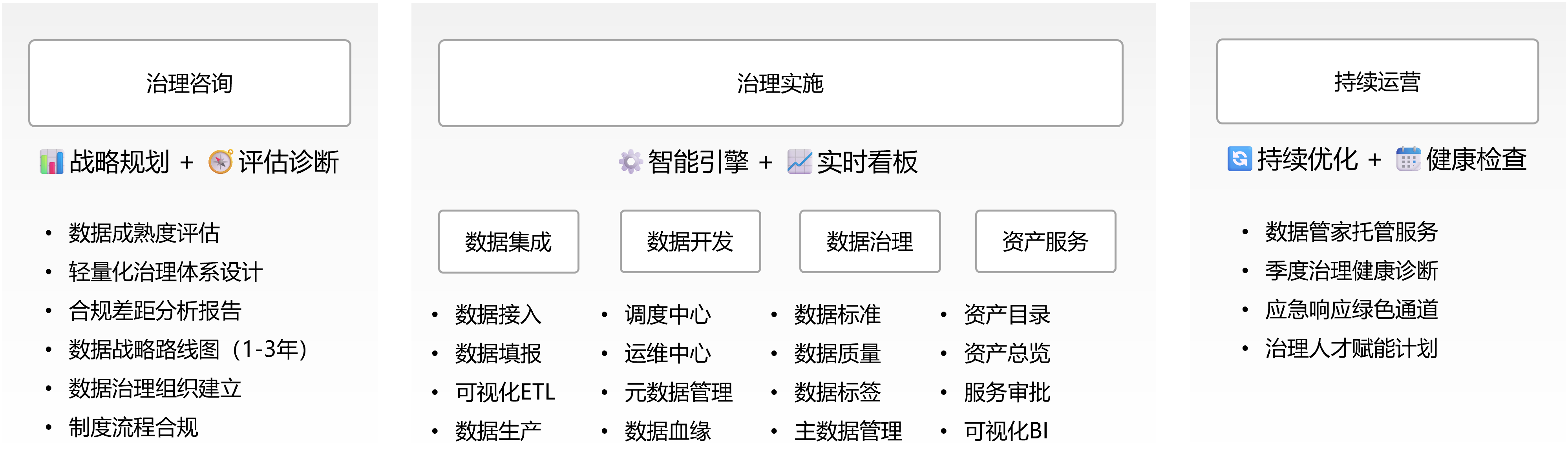 數(shù)據(jù)治理服務(wù)流程圖“樞理”從戰(zhàn)略高度出發(fā),開展數(shù)據(jù)治理咨詢。通過數(shù)據(jù)成熟度評估,精準診斷企業(yè)數(shù)據(jù)管理現(xiàn)狀;設(shè)計輕量化治理體系,適配企業(yè)規(guī)模與業(yè)務(wù)特性;出具合規(guī)差距分析報告,保障數(shù)據(jù)管理符合行業(yè)規(guī)范。同時,繪制1 - 3年數(shù)據(jù)戰(zhàn)略路線圖,明確長期治理方向;協(xié)助建立數(shù)據(jù)治理組織,厘清職責分工;規(guī)范制度流程,讓數(shù)據(jù)治理“有章可循”,為后續(xù)治理筑牢頂層設(shè)計基礎(chǔ) 。